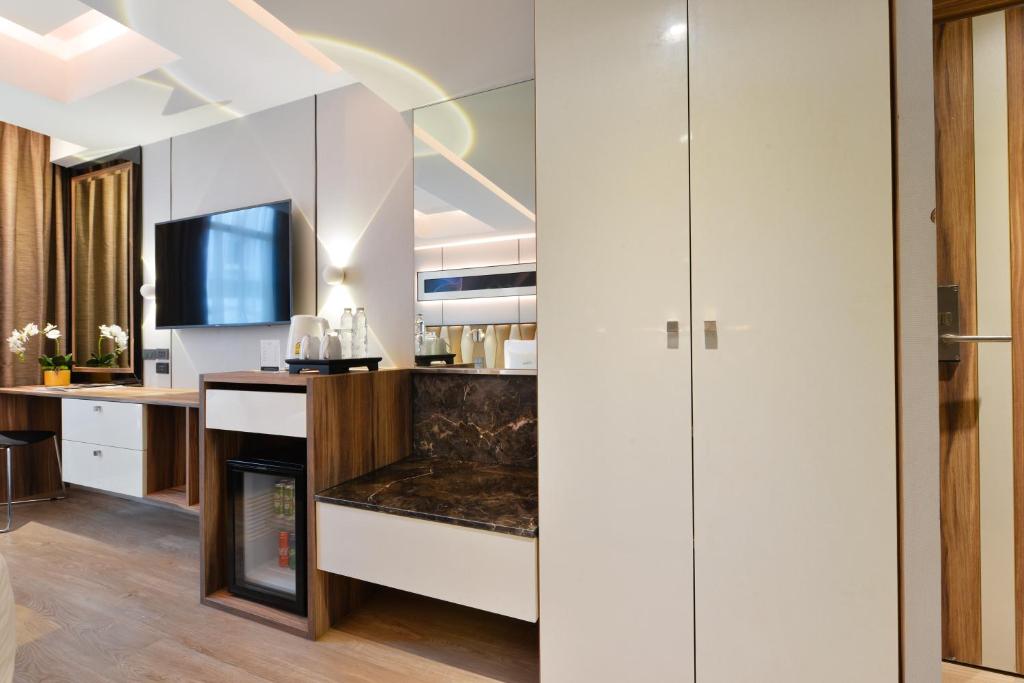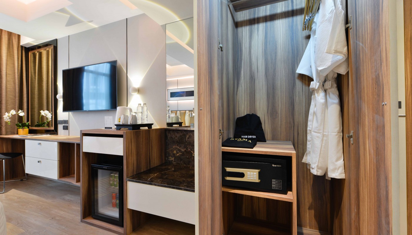 Each room is fitted with an incredibly comfortable bed, a large flat-screen TV, an electronic safety deposit box, and an electric kettle (upon request). Our modern bathrooms include a walk-in rain shower with a selection of complimentary Syama toiletries.